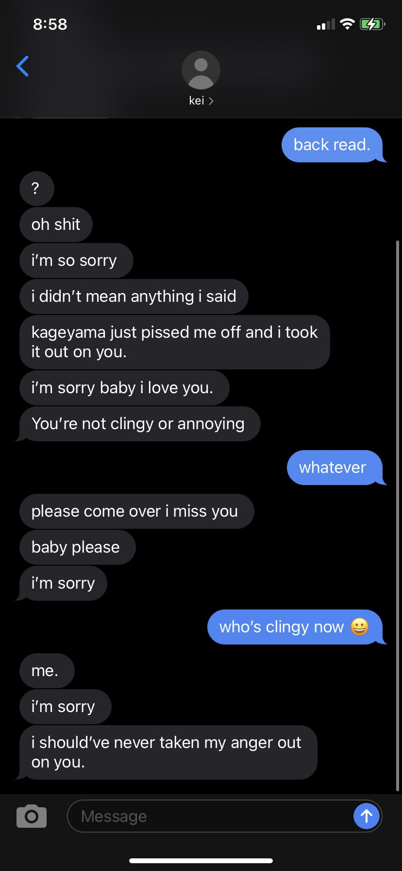 Haikyuu feeling clingy after work and yn not being home pt. He regrets what he called you he really did he just didnt feel the need to say so.